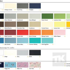 • Leverbaar in 33 kleurvarianten + 4 kleuren in vochtbestendige PVC stof, eveneens allen variërend in lichtdoorlatend en verduisterend.