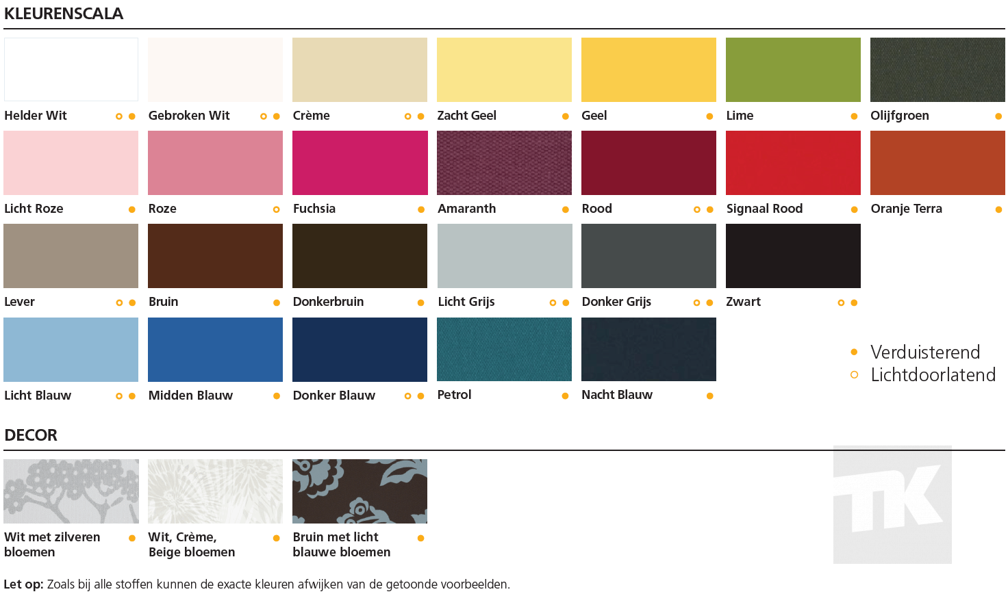 • Leverbaar in 28 kleurvarianten, variërend in lichtdoorlatend en verduisterend.